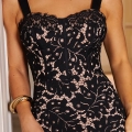 Vestido midi em renda preta com desenho floral sobre base nude, criando contraste sofisticado e efeito marcante na silhueta. Possui busto estruturado com recortes que remetem ao corset, alças largas e acabamento delicado no decote. Modelagem ajustada ao corpo com fenda posterior e detalhe de amarração de ajuste nas costas estilo corset.