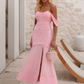 Vestido midi em rosa claro, em crepe com pedrarias mallorca, com decote ombro a ombro, mangas estruturadas e aplicação manual de pedrarias delicadas que valorizam o design. A modelagem ajustada no corpo com saia fluida cria uma silhueta elegante e feminina, alinhada à tendência do romantic glam e dos tons candy, destaque no Verão 2026. Uma peça impactante e sofisticada, ideal para eventos especiais, festas e ocasiões de destaque. Fechamento: Zíper de metal nas costas.